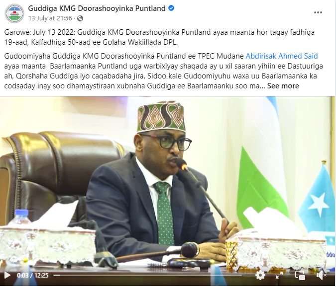 Garowe: July 13 2022: Guddiga KMG Doorashooyinka Puntland ayaa maanta hor tagay fadhiga 19-aad, Kalfadhiga 50-aad ee Golaha Wakiillada DPL. Gudoomiyaha Guddiga KMG Doorashooyinka Puntland ee TPEC Mudane Abdirisak Ahmed Said ayaa maanta Baarlamaanka Puntland uga warbixiyay shaqada ay u xil saaran yihiin ee Dastuuriga ah, Qorshaha Guddiga iyo caqabadaha jira, Sidoo kale Gudoomiyuhu waxa […]