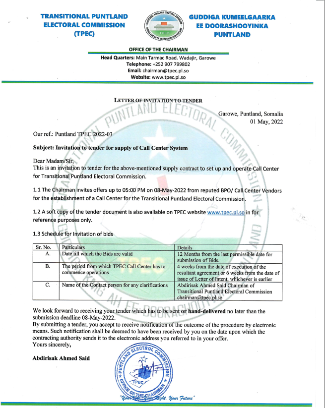 Request for proposal (RFP) of provision of money Transfer Services for the Transitional Puntland Electoral Commission (TPEC)