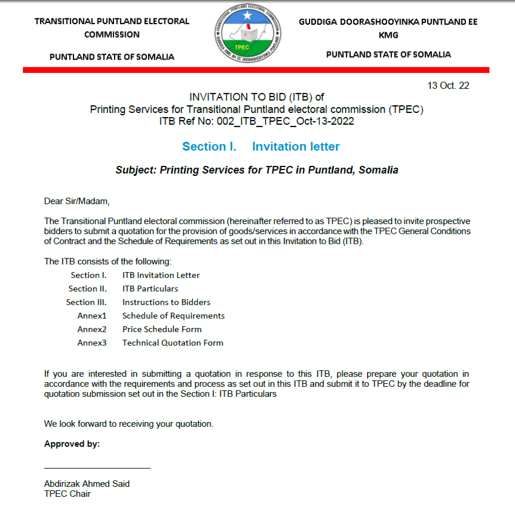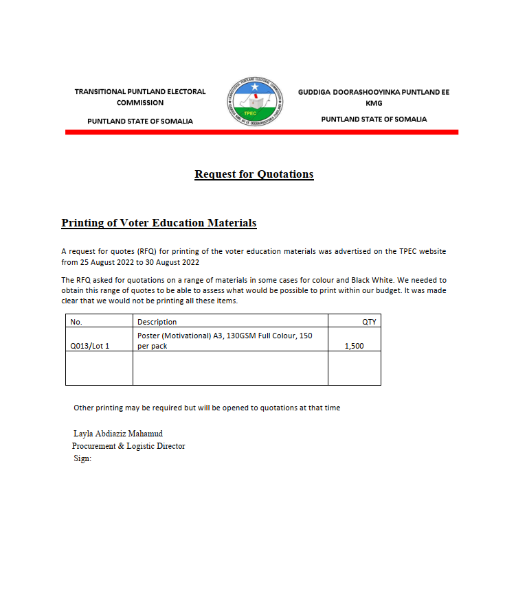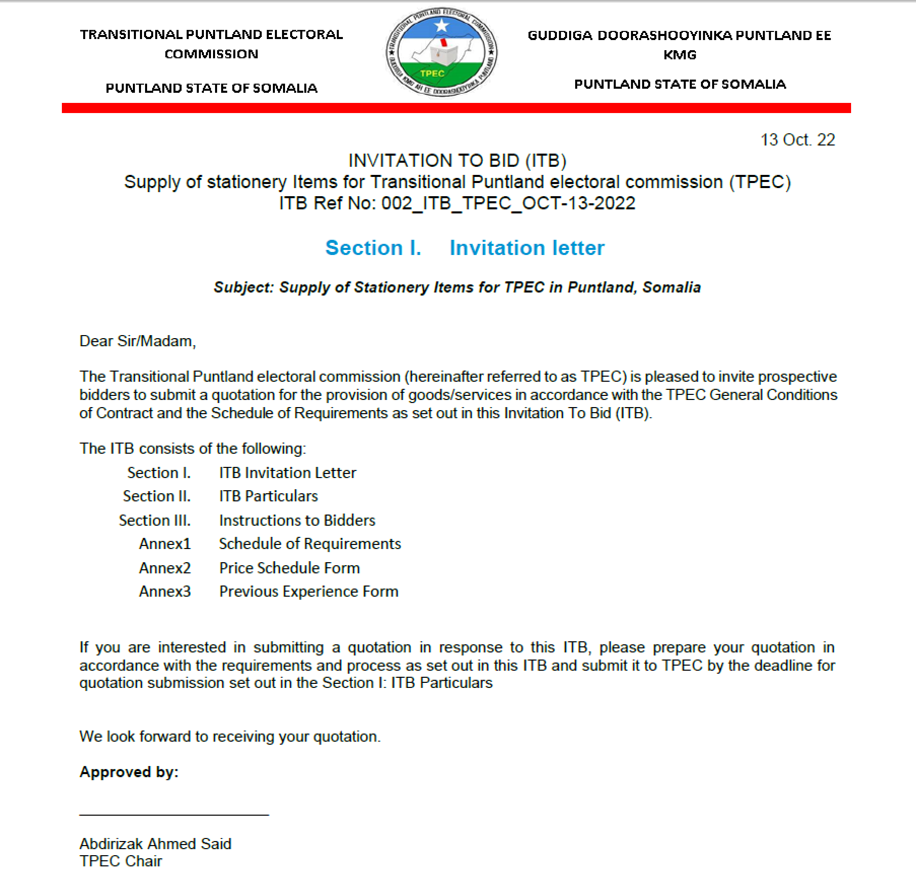 Supply of Stationery Items for TPEC in Puntland, Somalia
